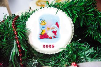 Новогодний имбирный пряник ручной работы с изображением новогодней змеи и санты - симола 2025 года.